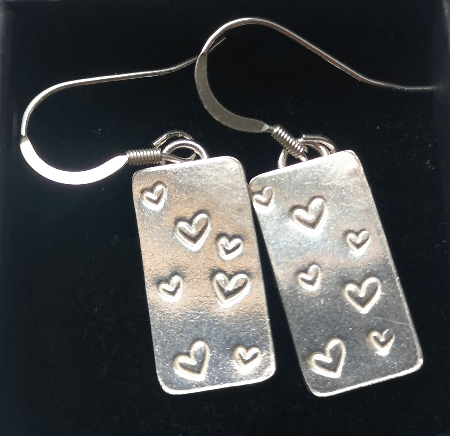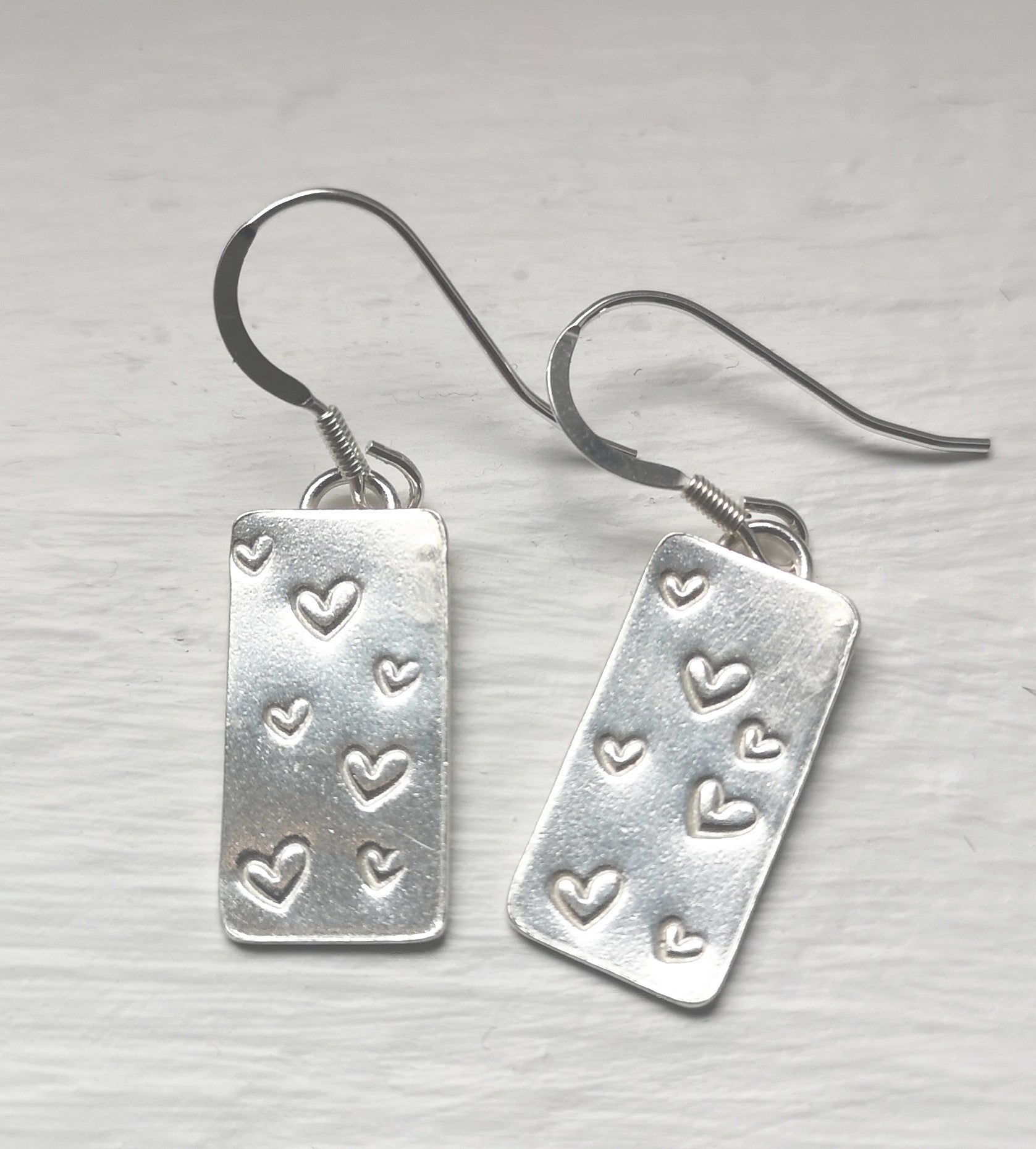 Handmade on Tiree. Sterling Silver heart hammered earrings.